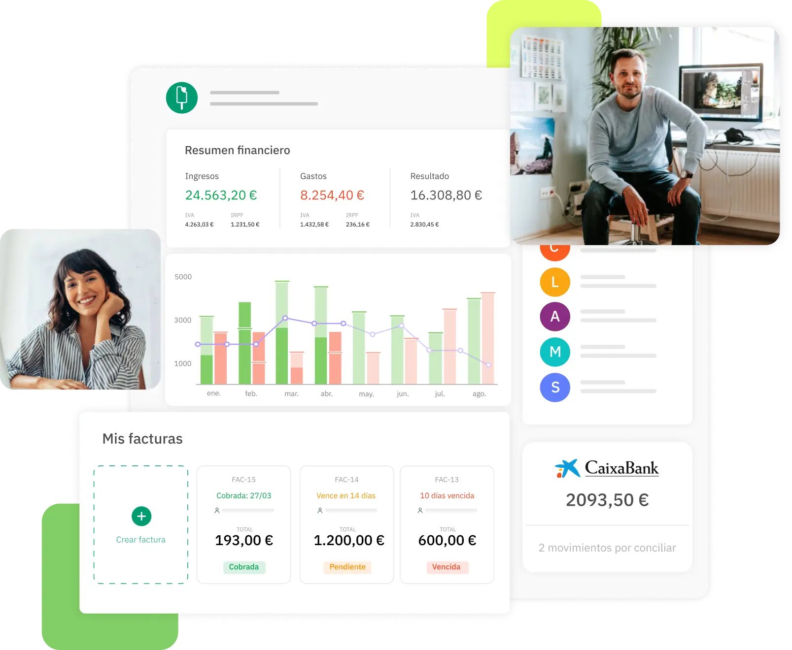 De un vistazo conoces datos tan importantes como: los ingresos que has generado, los gastos, el IVA e IRPF a liquidar, las facturas pendientes de cobro y el volumen de ventas por cliente.